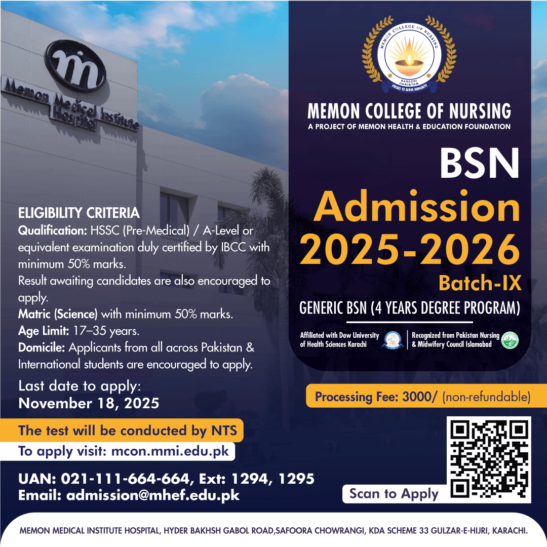 Your entrance test for the BSN 2025–2026 program has been scheduled by NTS on Sunday, November 30, 2025, at 11:00 AM sharp.